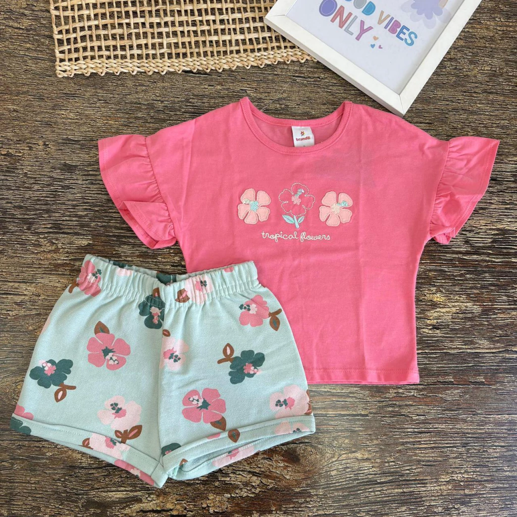 O Conjunto Blusa e Shorts Tropical Flowers da Brandili, acompanha uma blusa rosa de manga que traz a delicadeza da estampa Tropical Flowers, enquanto o shorts estampado com flores completa o look com charme e frescor. Confeccionado em tecido macio e confortável, é perfeito para os dias quentes, garantindo liberdade de movimentos e estilo. Vista sua menina com alegria e leveza!